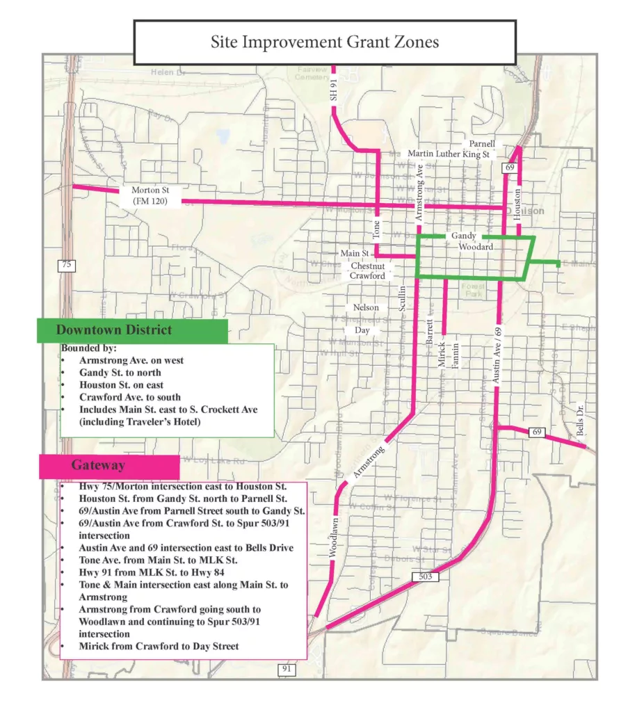 Most Site Improvement Grant Programs are matching grant programs funded by the Denison Development Alliance (DDA) to improve the appearance of business sites that are in highly visible areas as defined by the Denison Development Alliance and to encourage quality design. Site Improvement Grants are designated to assist in two areas, each with unique requirements and qualifications: